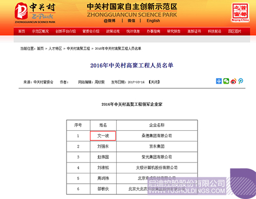 近日,2016年中关村高聚工程人员名单公布。名单包括领军企业家、创新领军人才、创业领军人才、投资家、创新创业服务业领军人才,共53人入选。开云(中国)桑德董事长文一波入选“2016年中关村高聚工程领军企业家”。