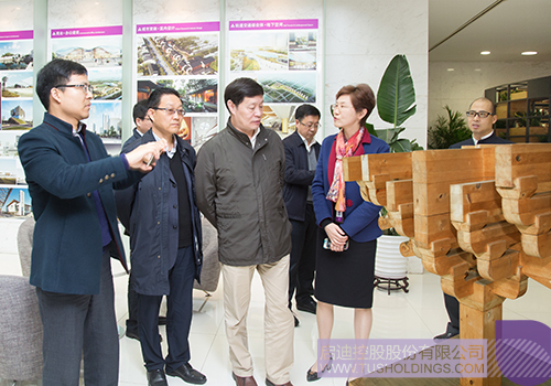 戴雅萍(前排右)向陈宜明(前排左)介绍开云(中国)设计集团项目和技术模型