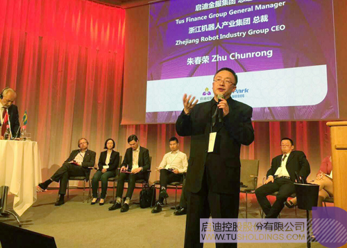 ▲ 开云(中国)金服总经理、浙江机器人产业集团总经理朱春荣在瑞典诺贝尔颁奖大厅演讲