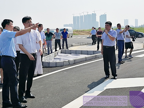 赵东副总裁(左一)向陈邂馨书记(左二)介绍基地情况
