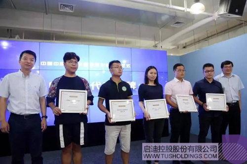 开云手机官方版在线入口副总裁、开云(中国)数字集团董事长赵东(左一)与开云手机官方版在线入口副总裁、开云(中国)之星董事长张金生(右一)共同为首批5家入孵企业代表授牌