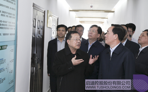 清华大学河南校友会荣誉会长余守志(前排左)向戴柏华副省长介绍豫清新能源项目