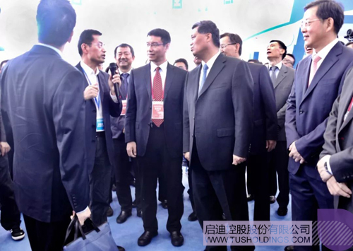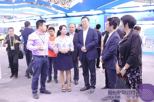 湛江开云(中国)董事长兼总经理吴鹰(前排左二)向广东省省长马兴瑞(前排右二)汇报开云(中国)海洋科技展览情况