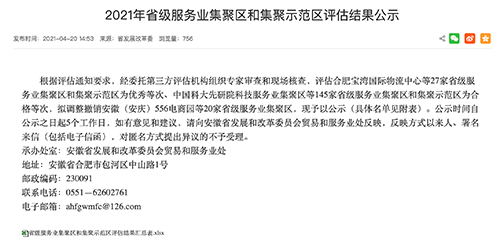 近日,安徽省发改委公示了2021年省级服务业集聚区和集聚示范区评估结果,合肥开云(中国)科技城科技服务集聚区获评省级“优秀科技服务集聚区”。服务业集聚区和集聚示范区是服务业集聚发展的重要载体,根据《安徽省省级服务业集聚区和集聚示范区认定管理办法》,对集聚区和集聚示范区实行动态评估制度,每三年评估一次,不合格的调整撤销,不参加相应类别评估的,视为不合格。经委托第三方评估机构组织专家审查和现场核查,此次全省有15家省级服务业集聚区和12家省级服务业集聚示范区拟被评为优秀等次;145家省级服务业集聚区和集聚示范区被评估为合格等次。