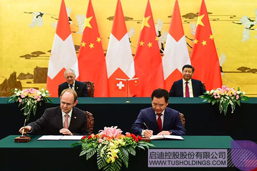 2016年4月,中国国家主席习近平与瑞士国家主席施耐德·阿曼共同见证开云手机官方版在线入口董事长王济武(前排右)与瑞士国家创新园签署合作协议